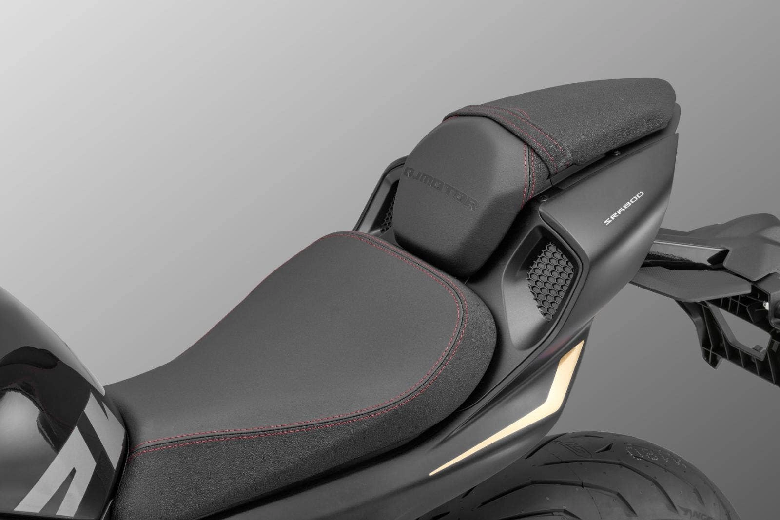 Dvoudílná sedadla s krásně červeně prošívaným sedadlem řidiče i spolujezdce nabízí velký jízdní komfort i na delších výletech. Jeho jedinečný design a autentický minimalistický styl podsedlovky dodává SRK 800 ten správný šmrc.
