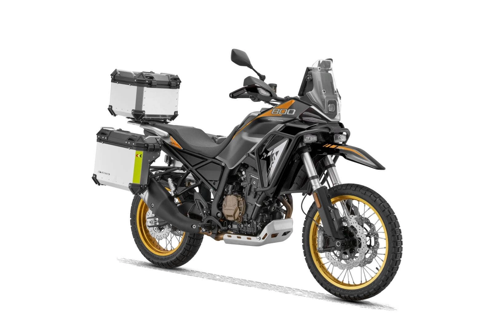 Přední i zadní brzdové třmeny dodává pro SRT 800S renomovaná značka BREMBO. Brzdy jsou dále vybaveny systémem ABS od firmy BOSCH. Radiálně montované přední brzdové třmeny spolu s radiální přední brzdovou pumpou a kotouči o velkém průměru vpředu i vzadu nabízí bezpečné zastavení i s plně naloženým strojem v každé jízdní situaci. Dva brzdové kotouče o průměru 320 mm vpředu a jeden 260 mm kotouč vzadu zajišťují přesně dávkovatelný a přitom silný brzdný výkon.