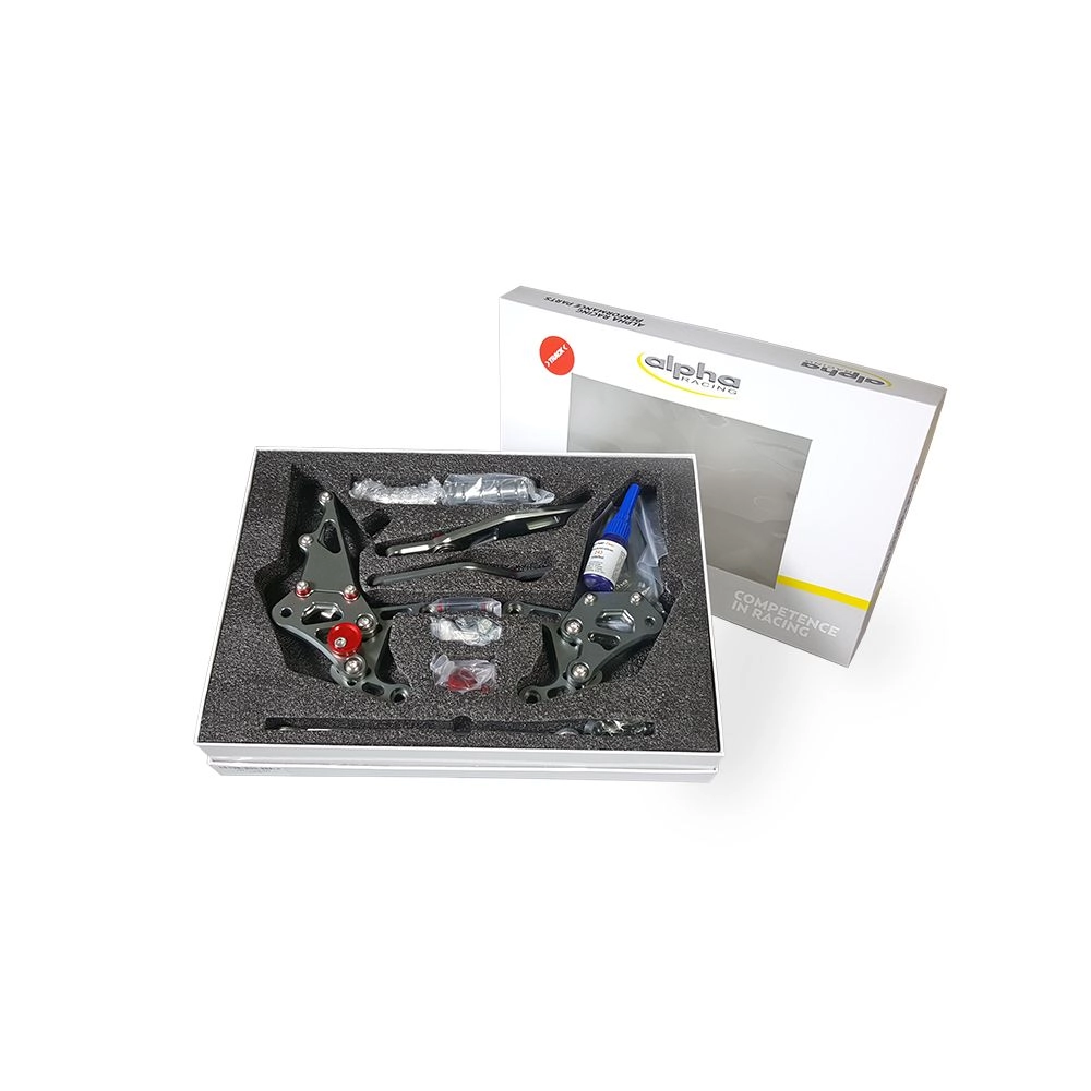 Systém stupaček >TRACK< , frézovaný hliník, barva: titanově eloxovaný s červenými aplikacemi, vícenásobné nastavení, pevné a sklopné stupačky jsou součástí sady, s ABE dle seznamu použití.