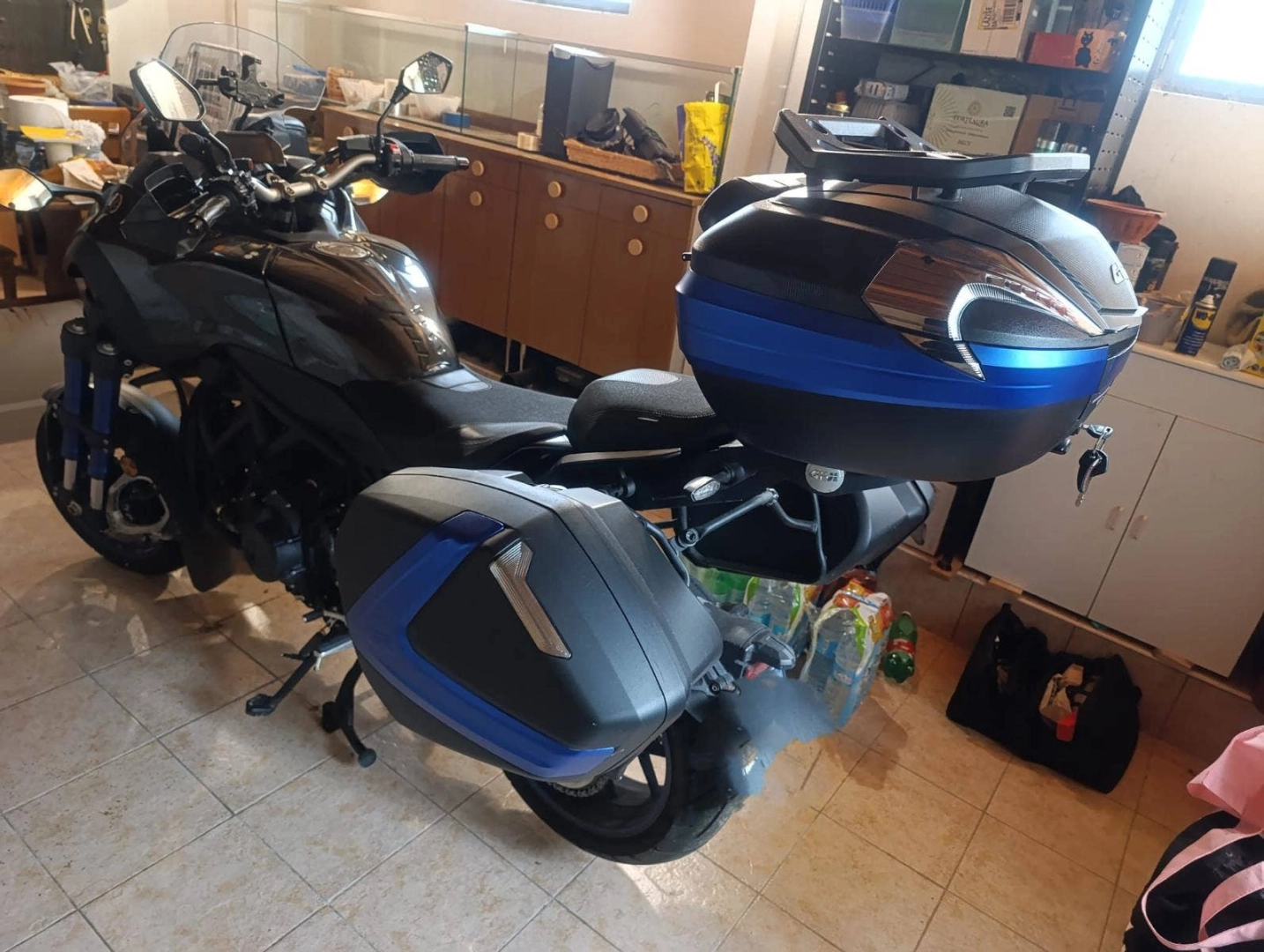 Vybaveno: vyhřívaná pohodlná sedadla, nástavce pod řidítka, vyhřívané rukojeti, kryty rukou, středový stojan, 2 boční brašny a horní kufr Givi.